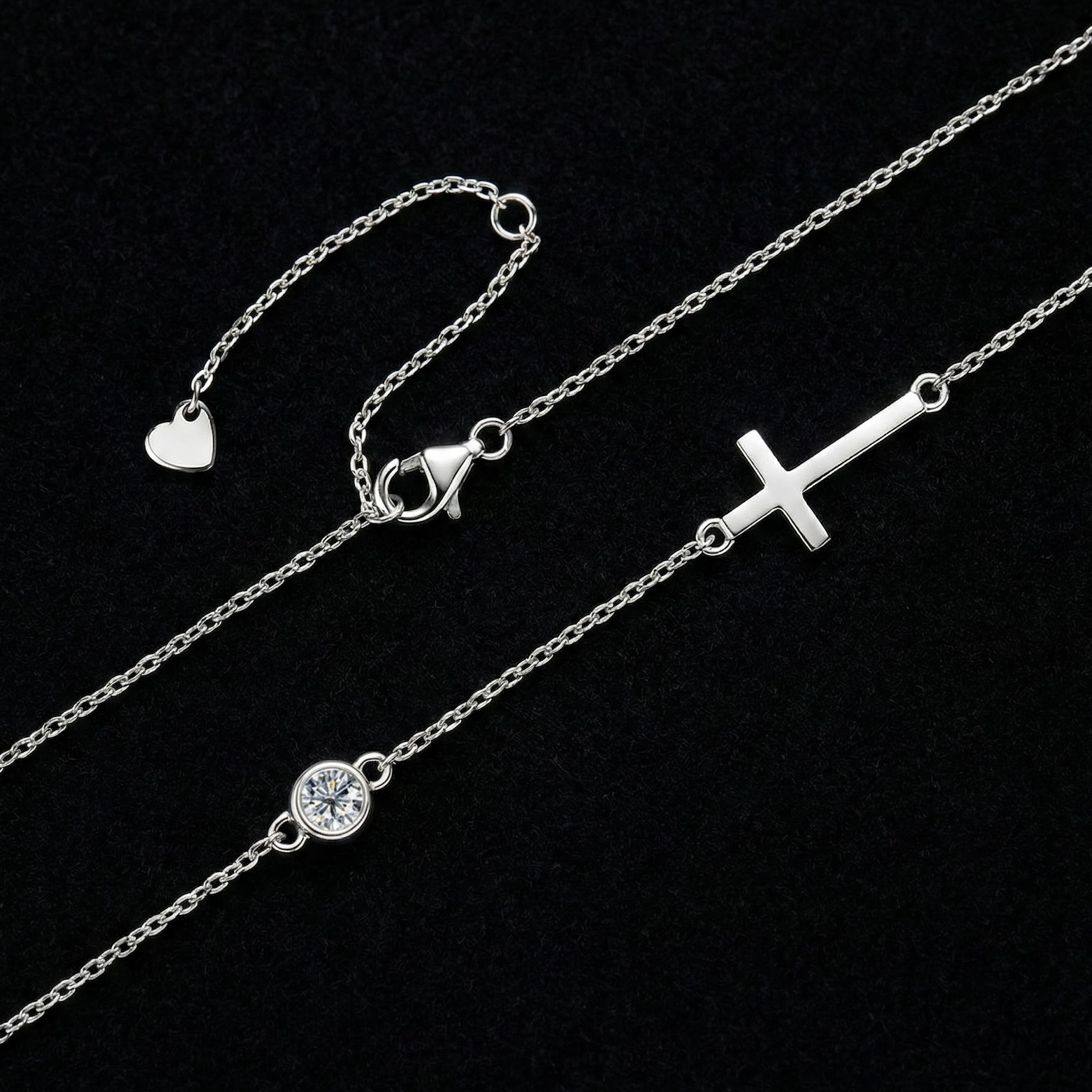 A sleek, horizontal cross subtly offset along a fine chain, accented by a single bezel-set stone for a touch of refined sparkle.