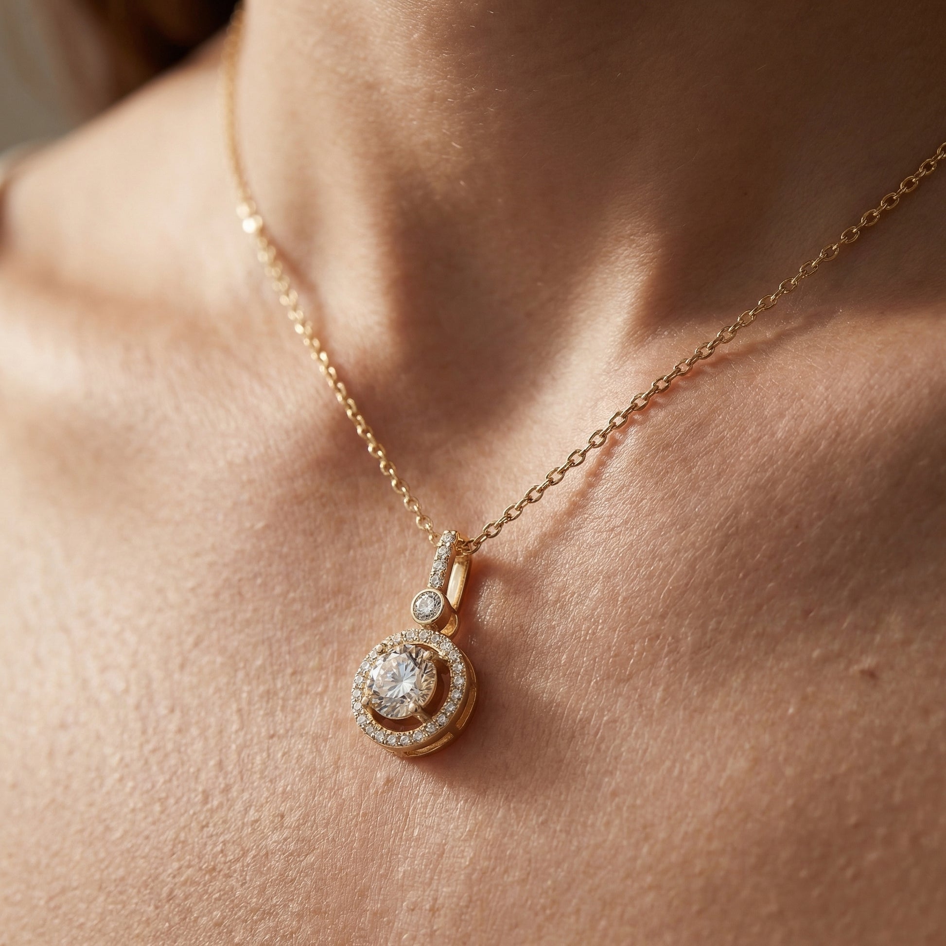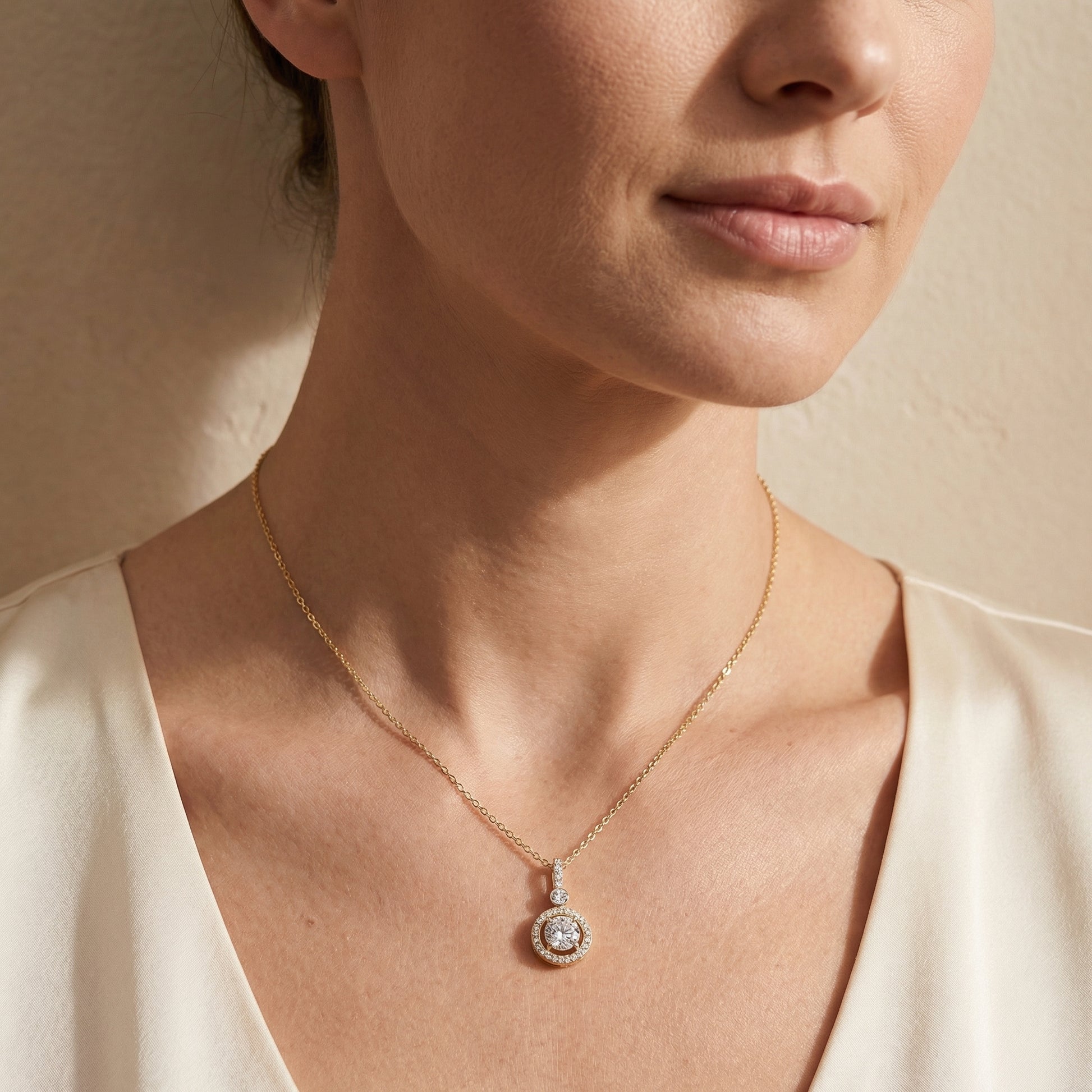 A dazzling round-cut center stone encircled by a halo of shimmering pavé stones.
