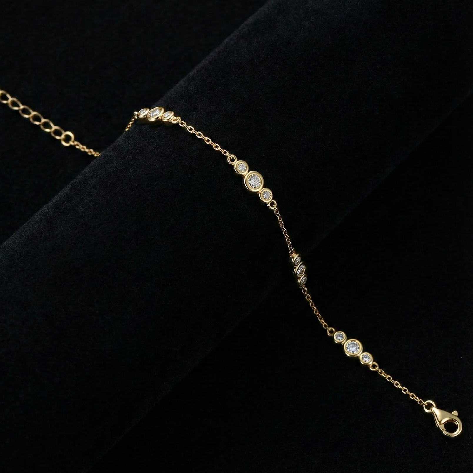 The Lurien Bracelet blends symmetry and brilliance through a sequence of bezel-set moissanite stones each precision-cut, perfectly aligned, and designed to flow seamlessly across the wrist.
