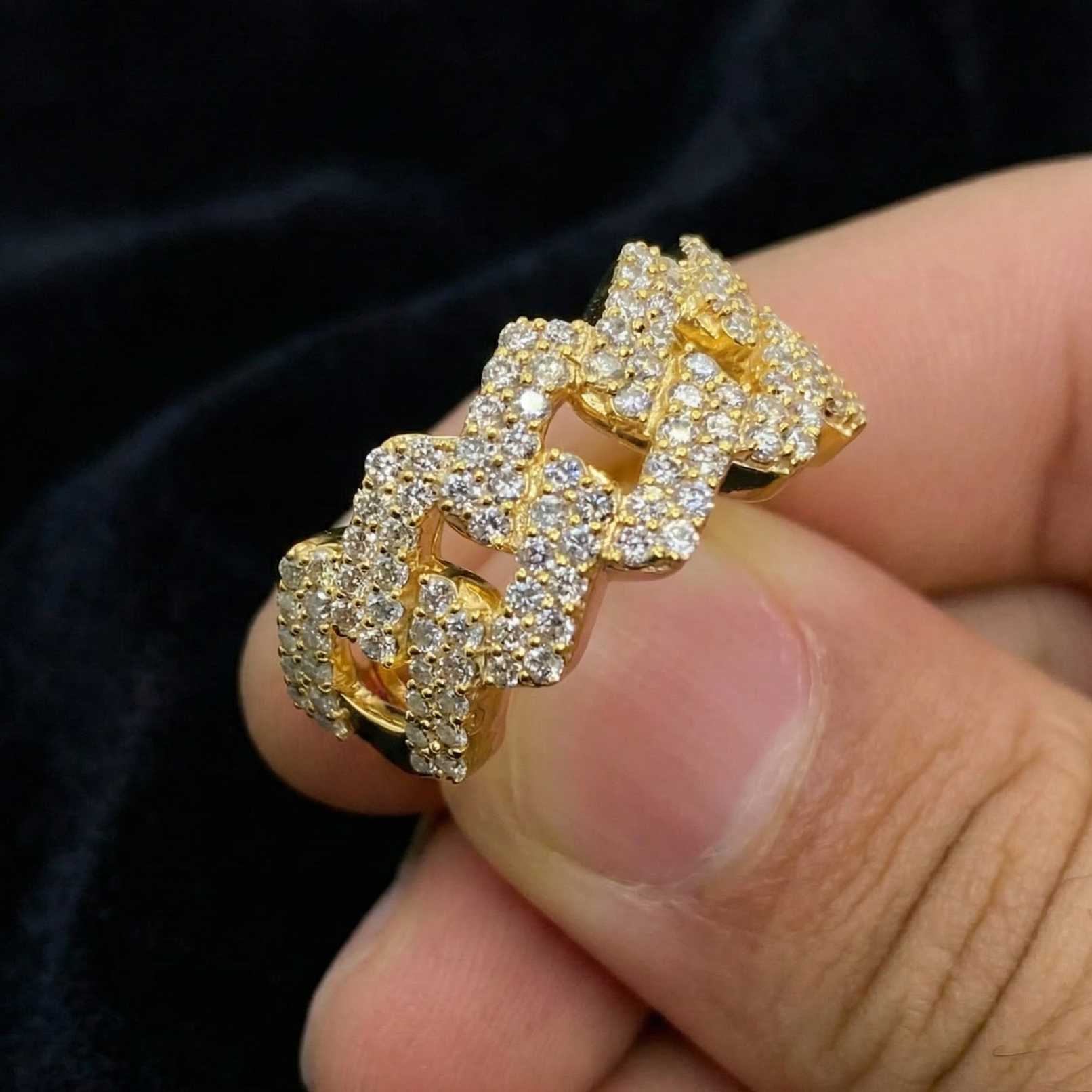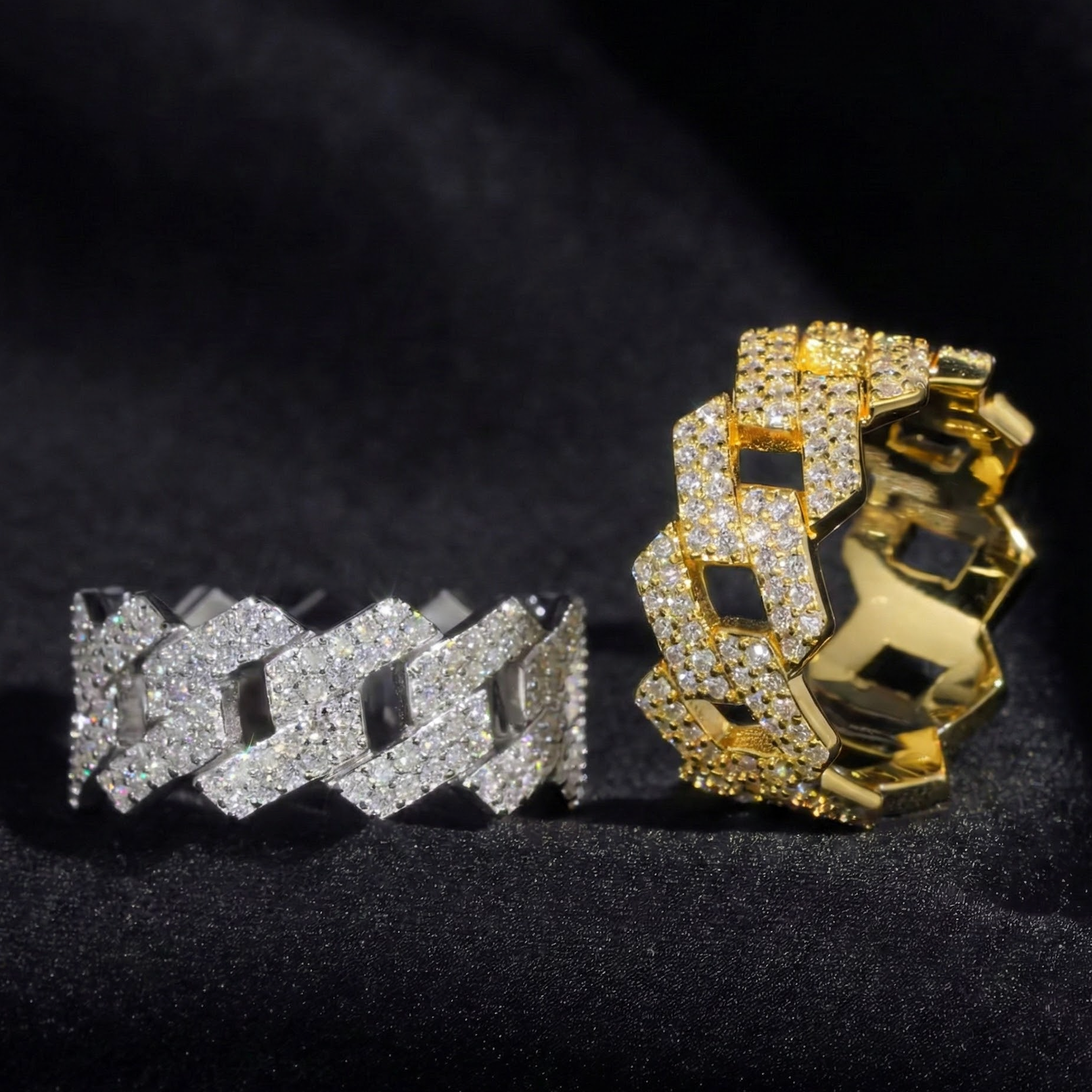 The Serrate redefines tradition with edge, featuring a geometric, link-like silhouette encrusted with our signature moissanite, set in a bold, serrated arc.