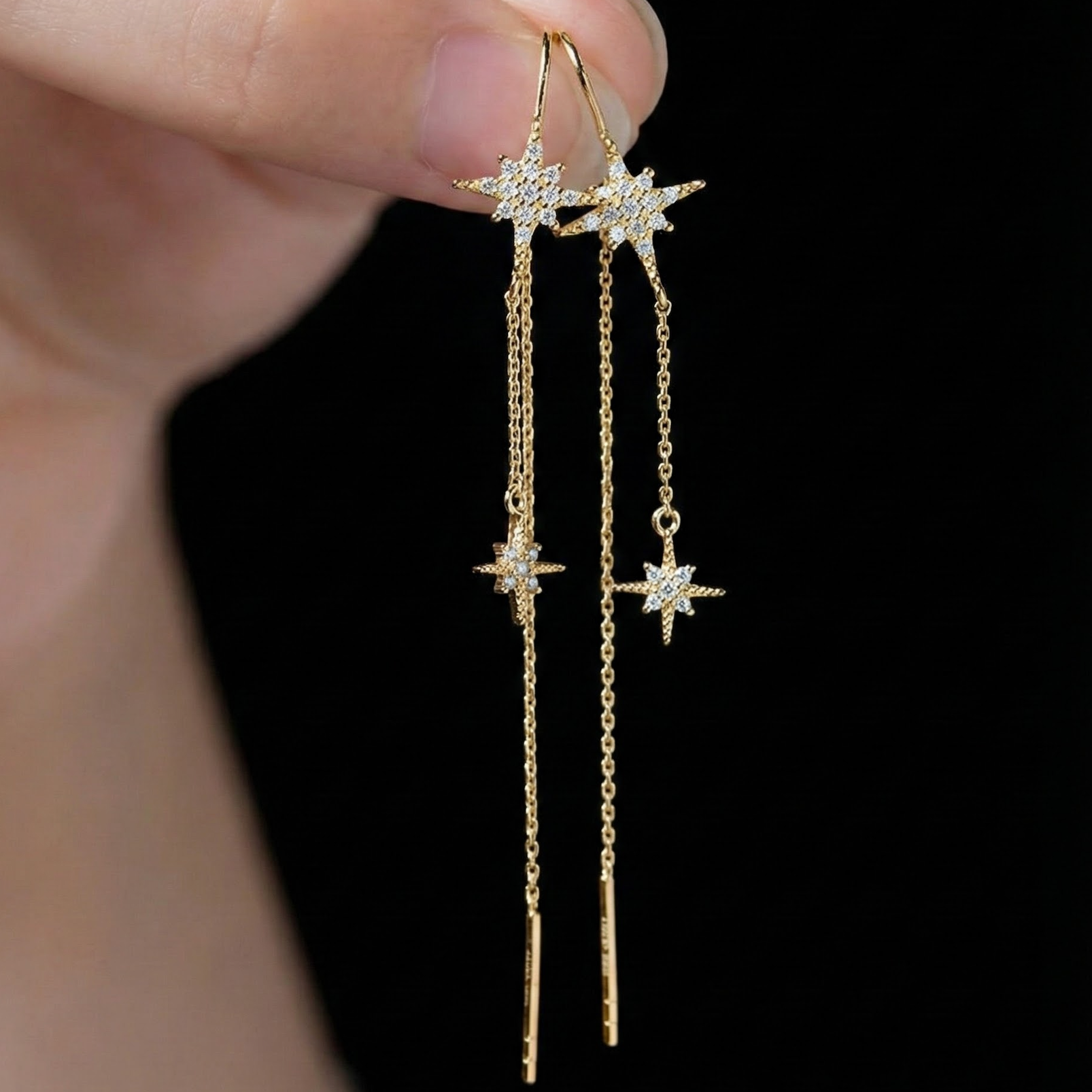 Shimmering motifs suspended from delicate gold chains, creating a celestial-inspired silhouette.