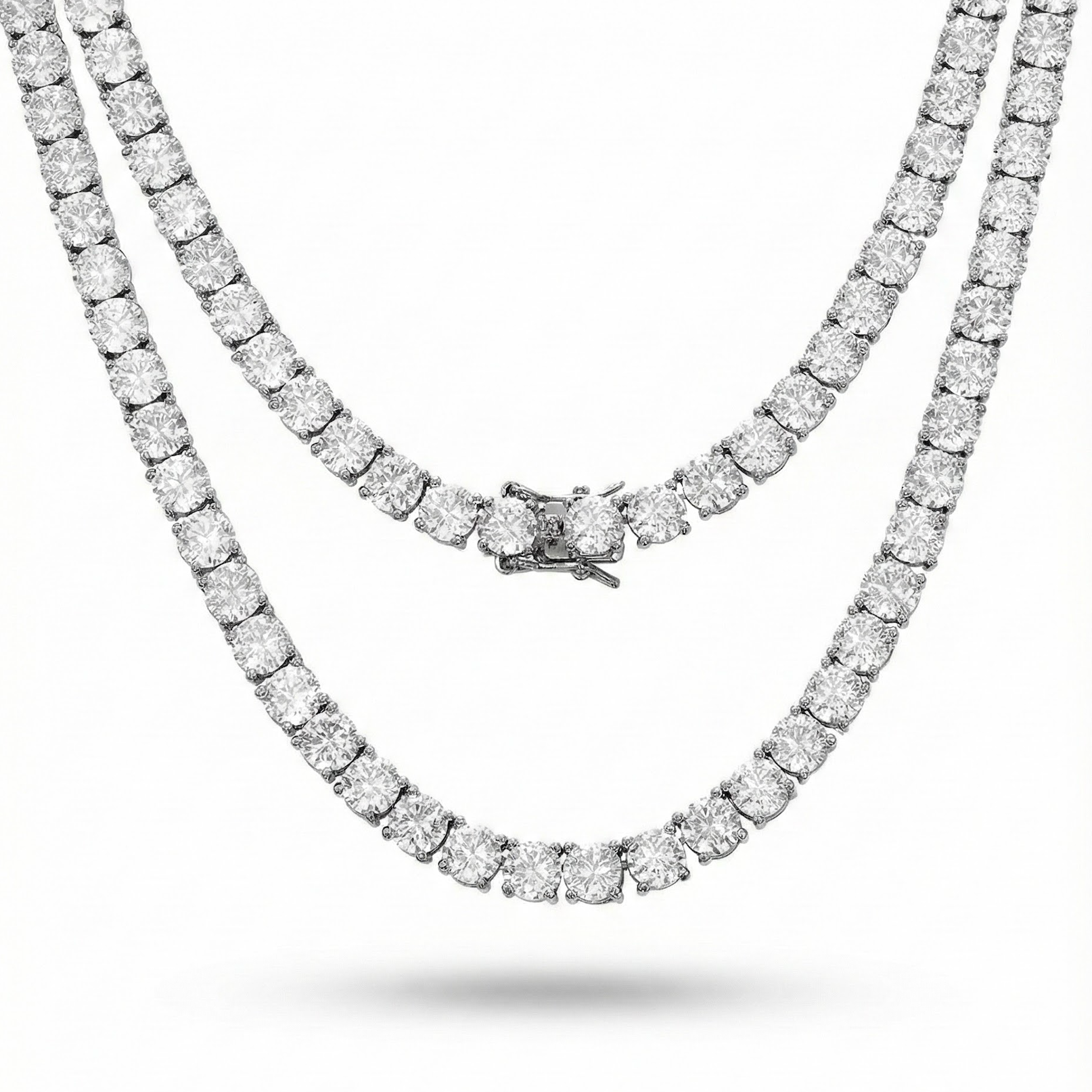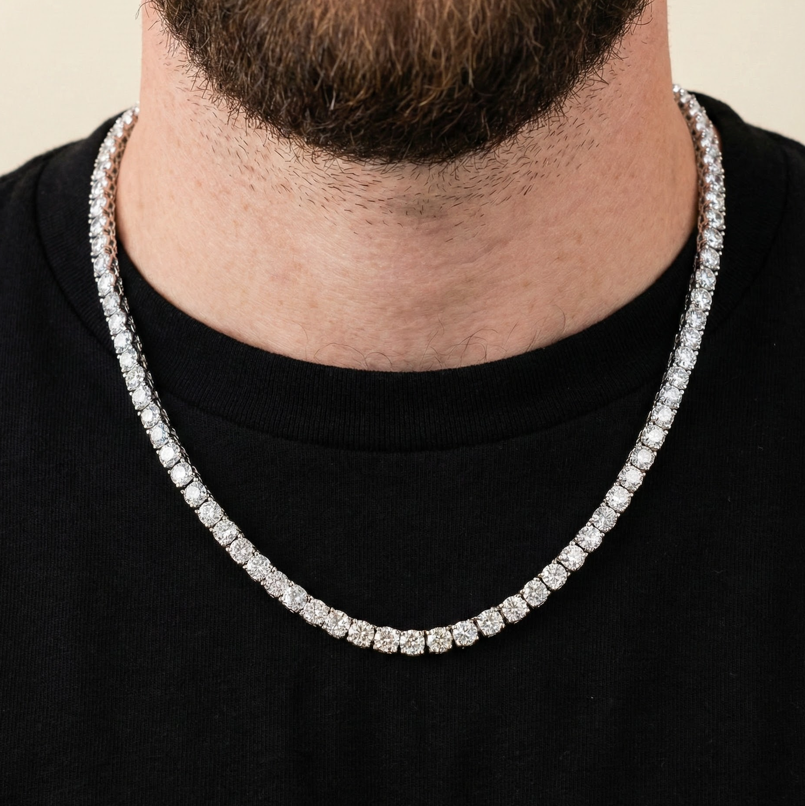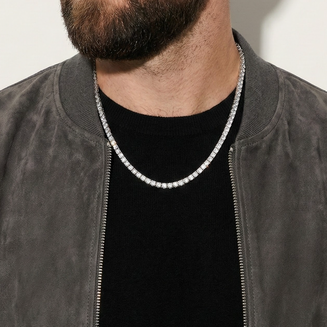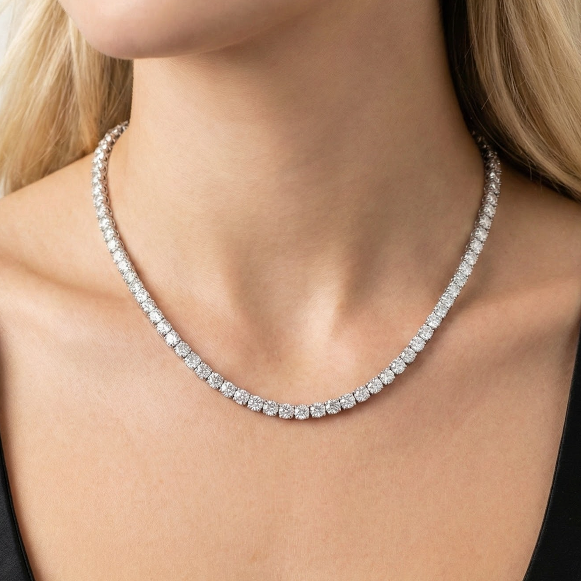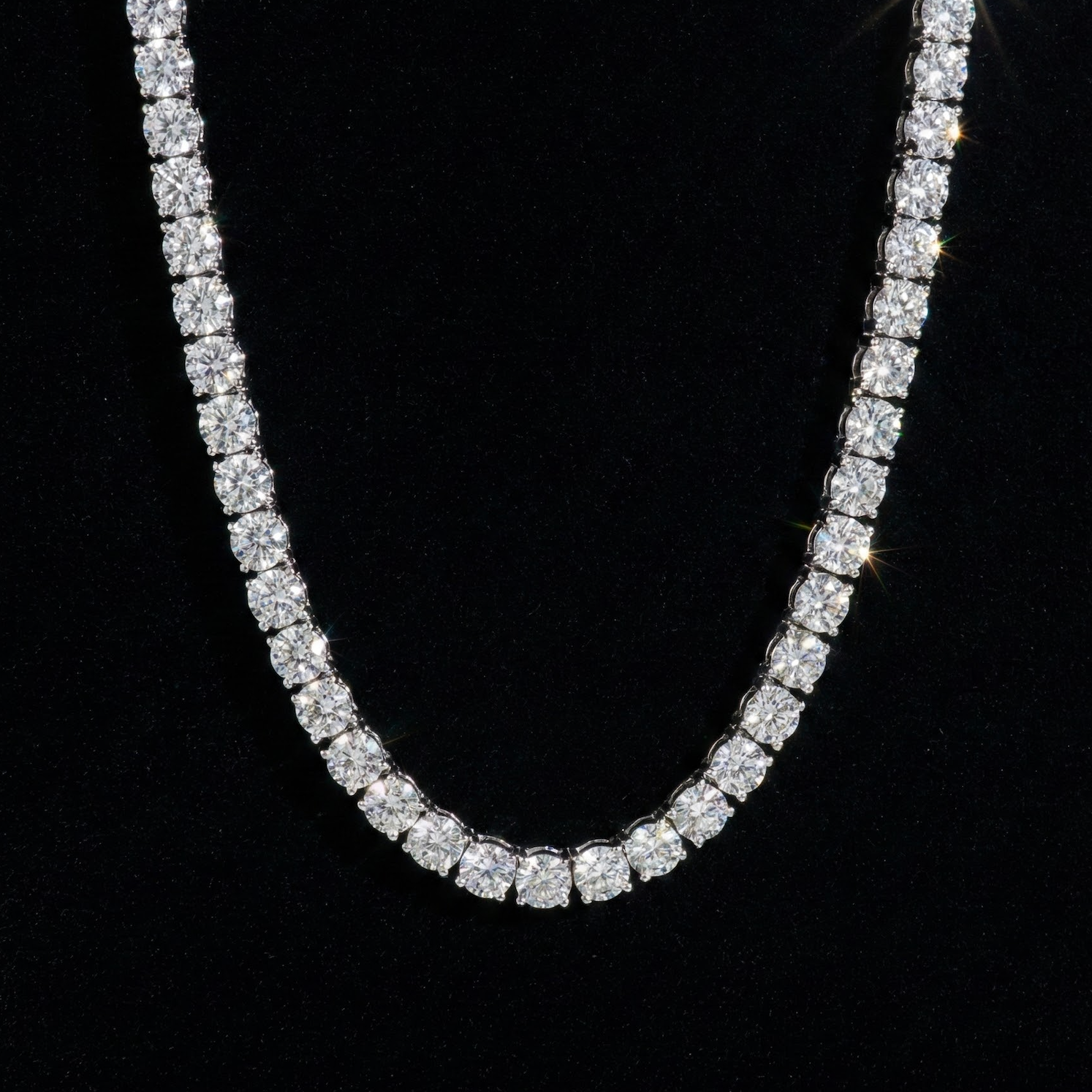 The Lumen Tennis Necklace delivers controlled brilliance through precision-cut VVS moissanite—diamond-like sparkle, refined restraint.