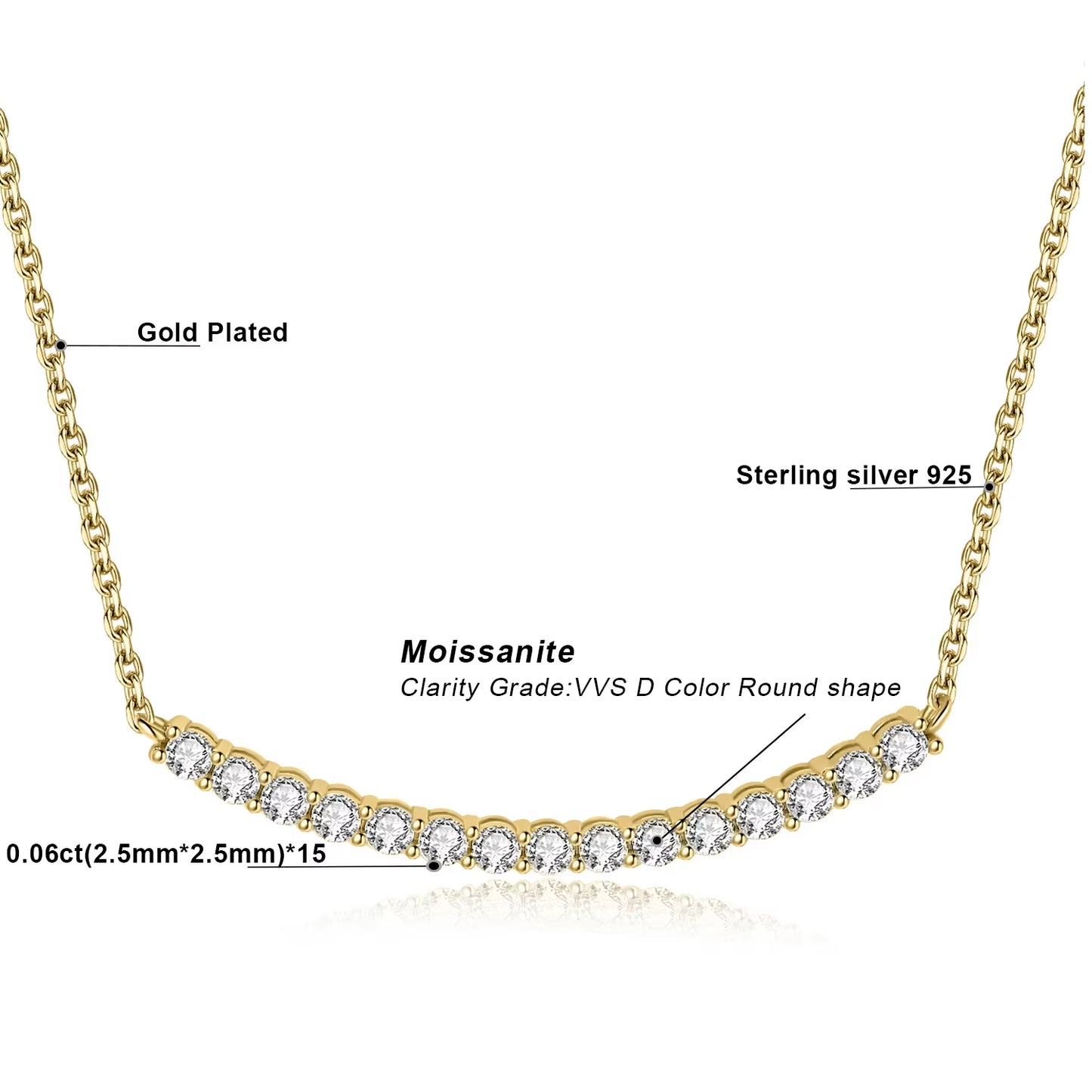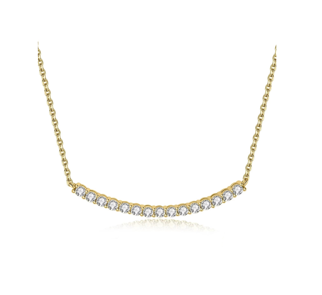 A delicate row of round-cut stones set in a gently arched gold bar, suspended on a fine chain.