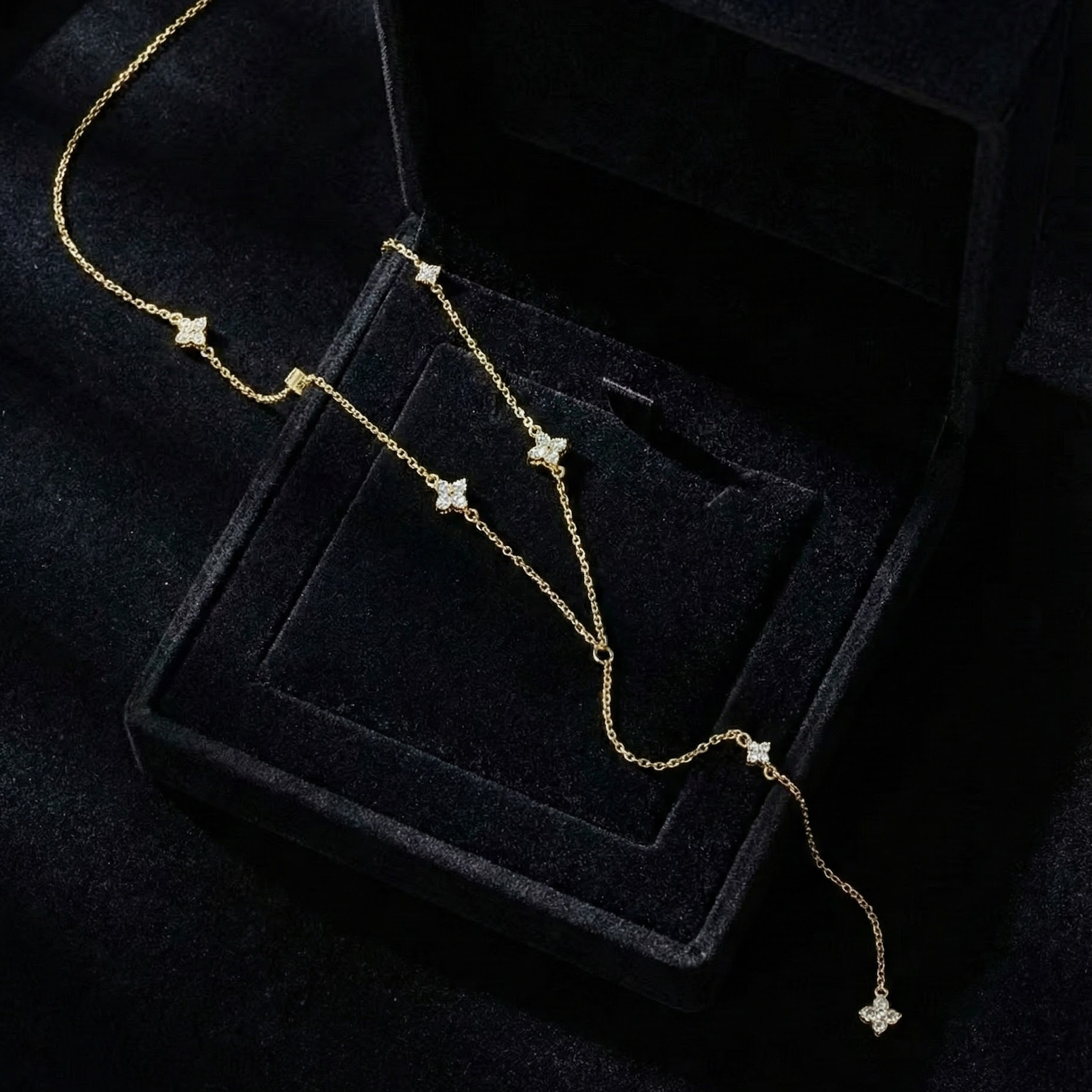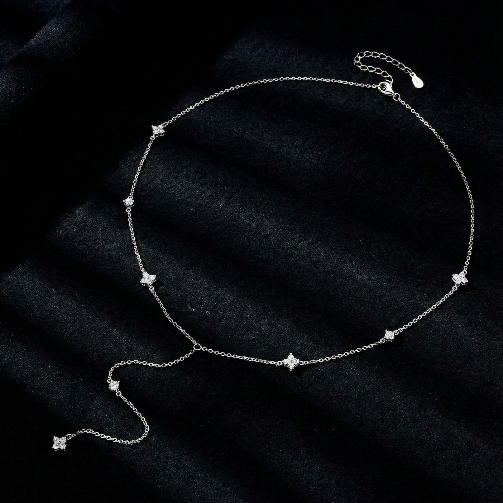 The Elystra Necklace draws inspiration from celestial bloom—tiny star-like petals arranged along a graceful Y-drop silhouette, ending in a luminous cascade of moissanite.