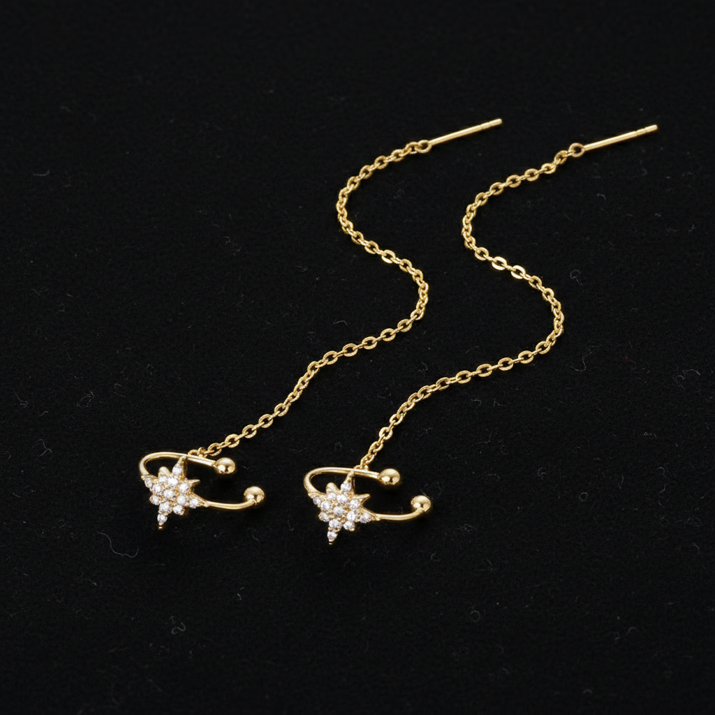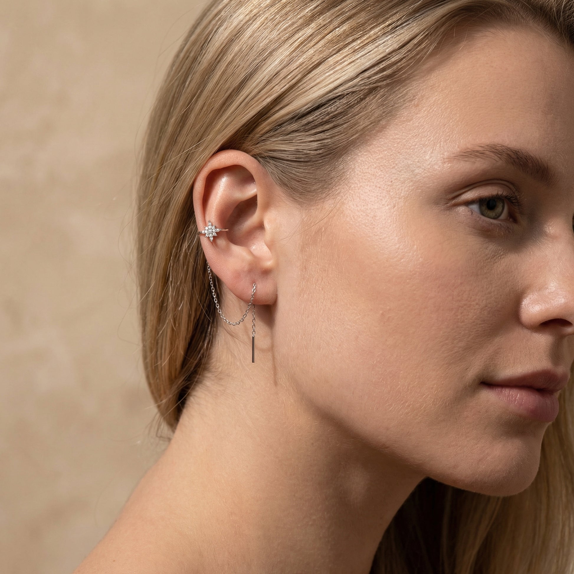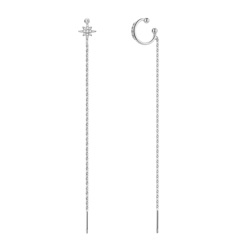 - A celestial-inspired design featuring a shimmering North Star stud connected to a matching ear cuff by a delicate 9cm drop chain.