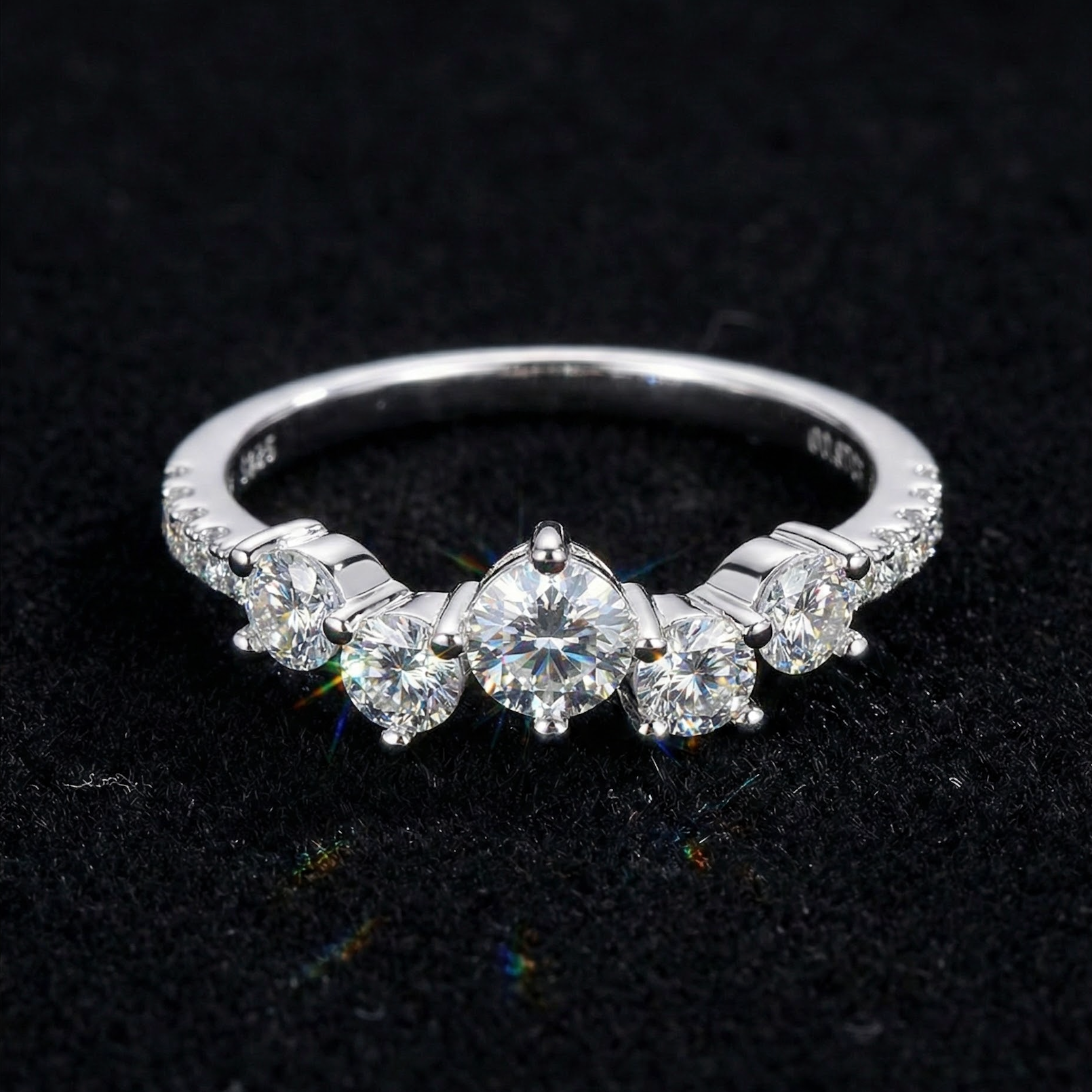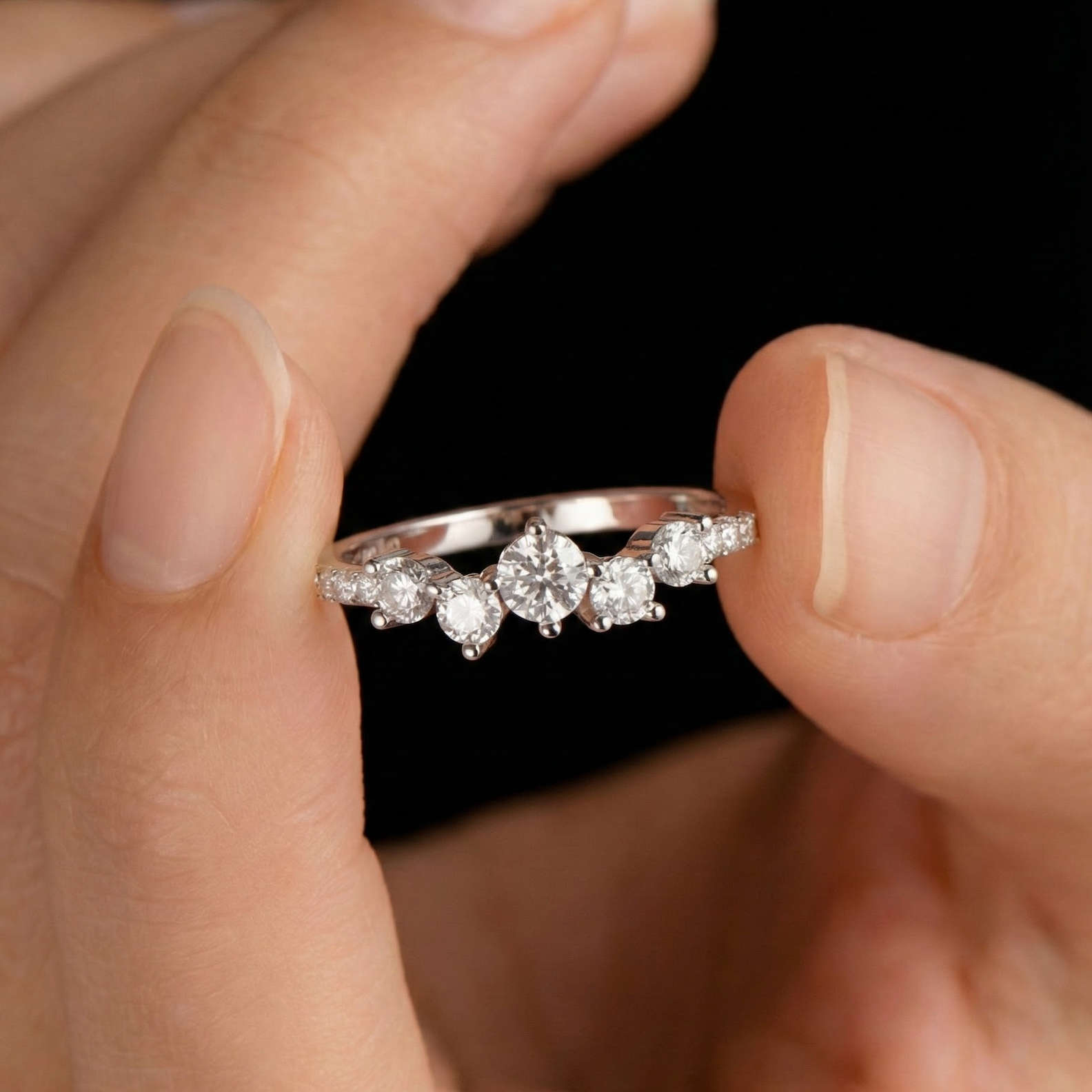 A radiant cluster of round-cut stones arranged in an ascending arc, resembling a sparkling constellation or delicate tiara.