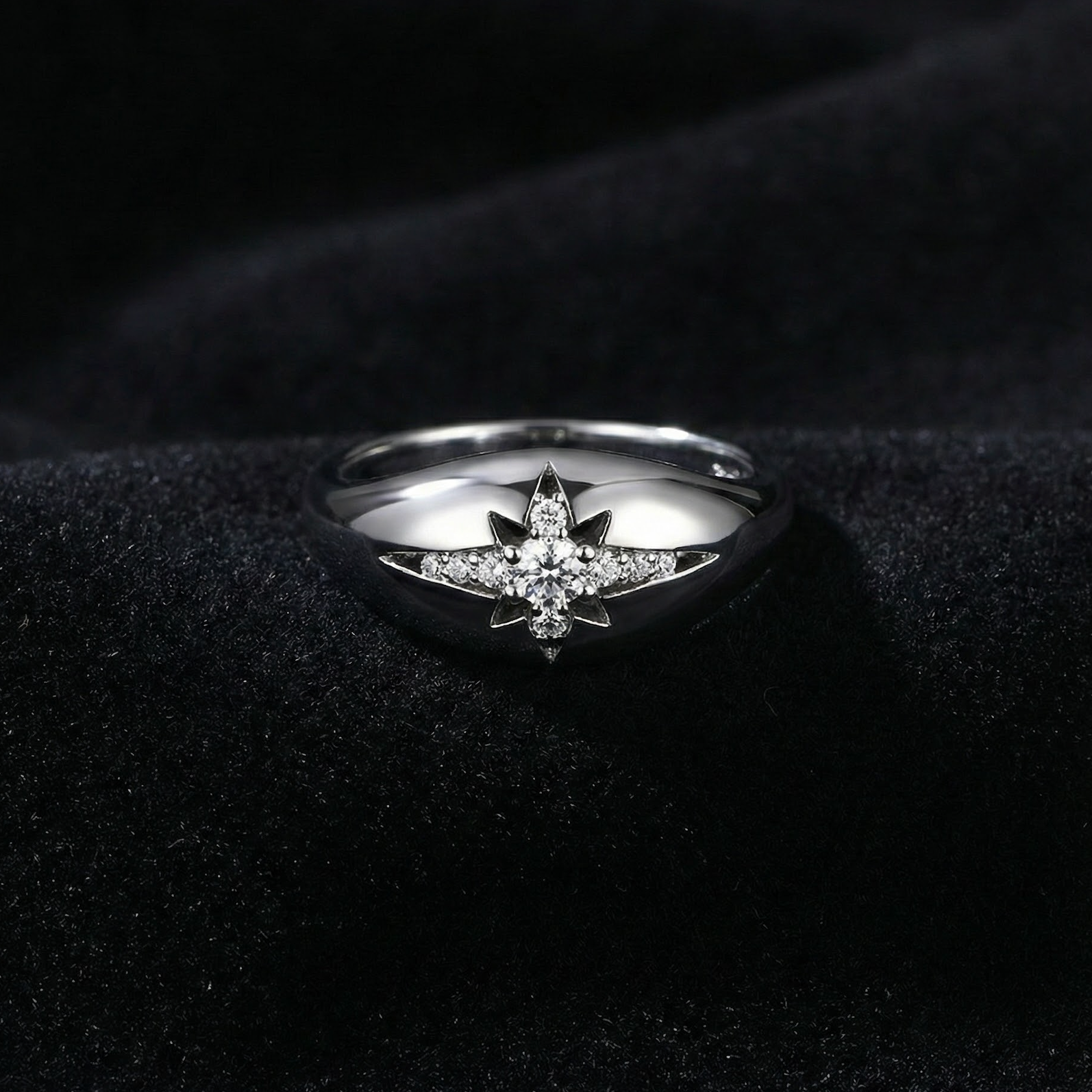 Crafted in polished silver, its sleek, domed silhouette exudes modern sophistication while capturing the guiding light of the stars.