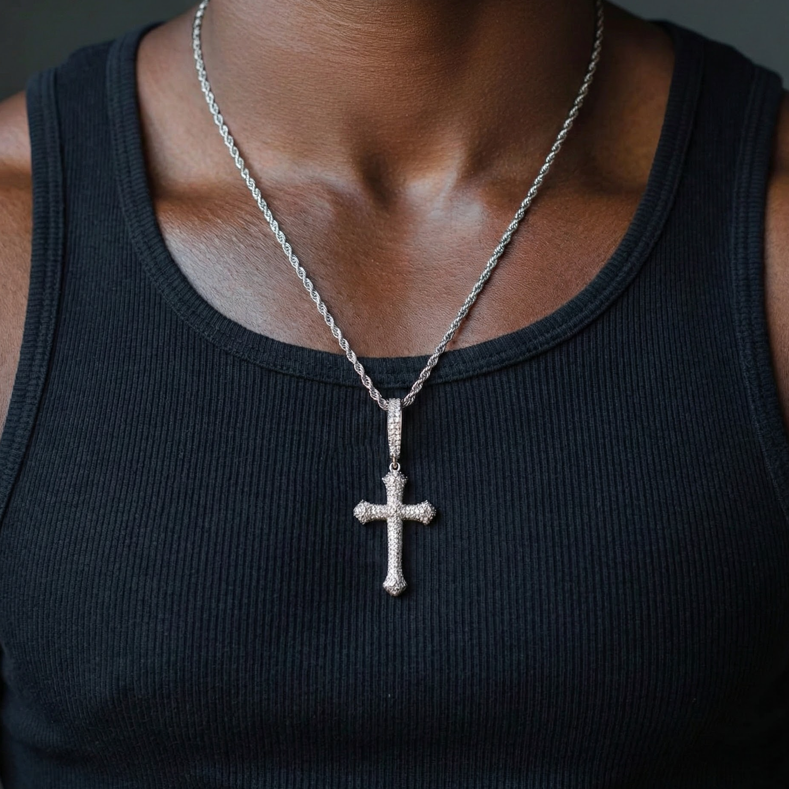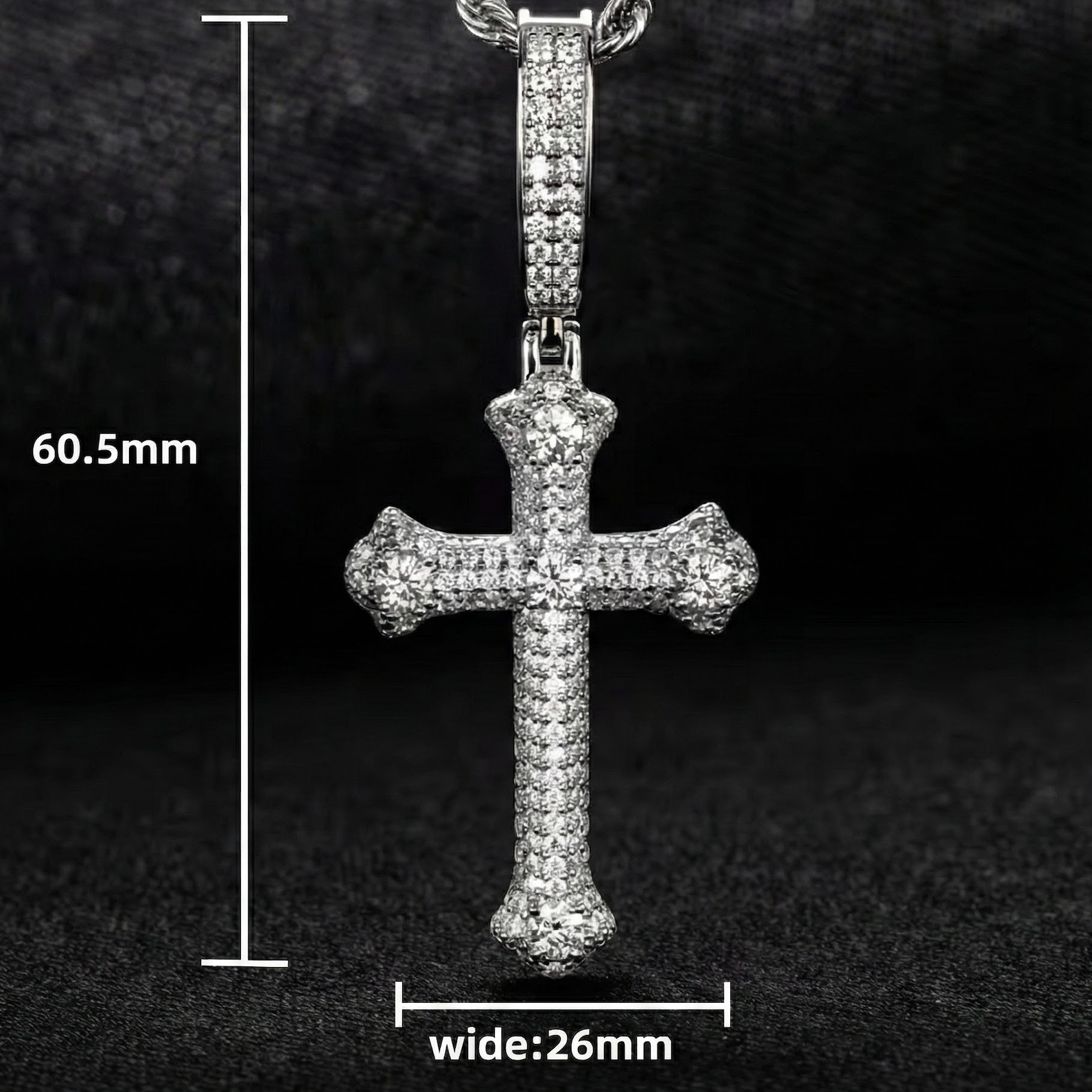 The Sorial Cross Pendant is a study in weight, clarity, and presence. Set with precision-cut moissanite totaling 3.98 cttw, it delivers controlled brilliance with unmistakable depth—diamond-tested, sharp, and intentional.