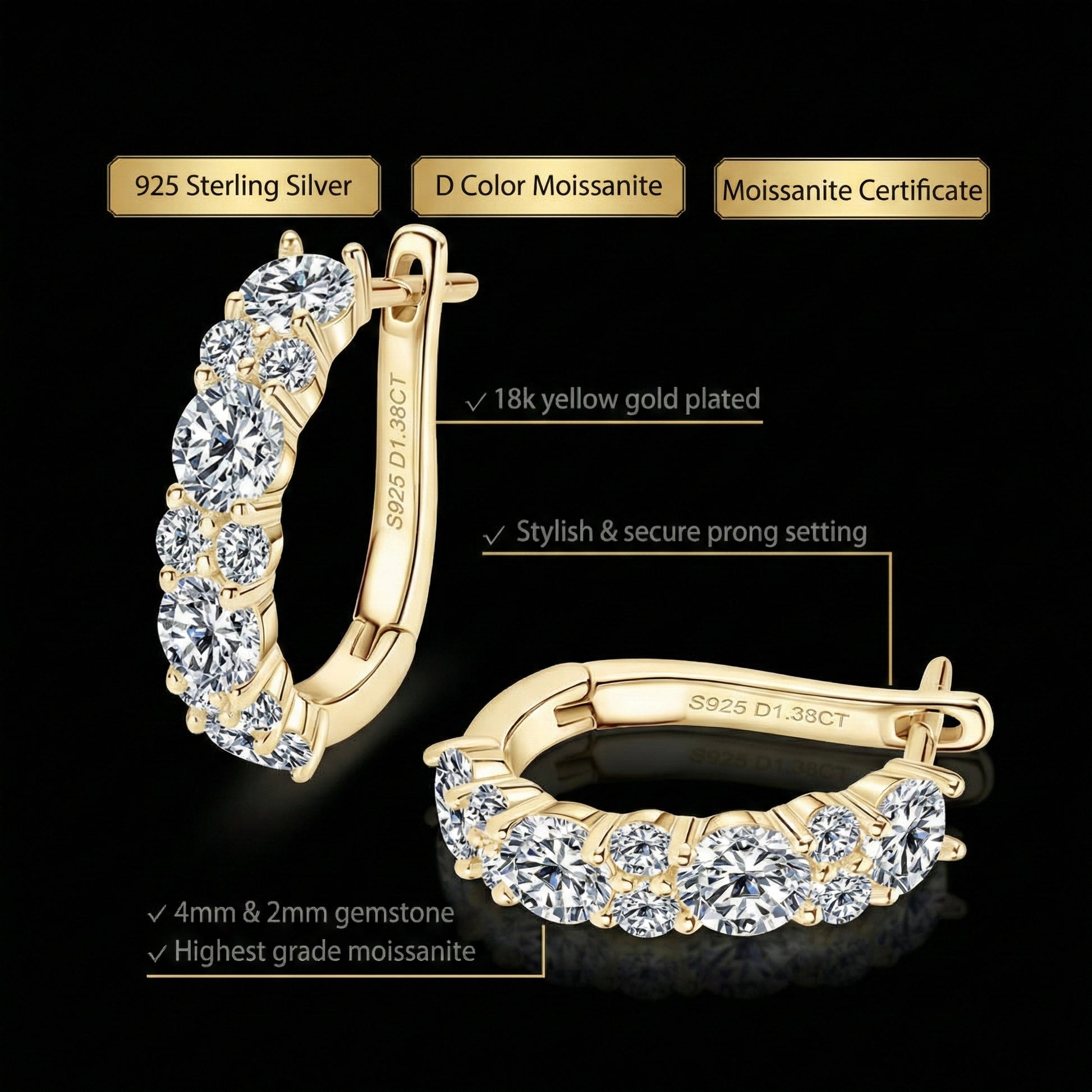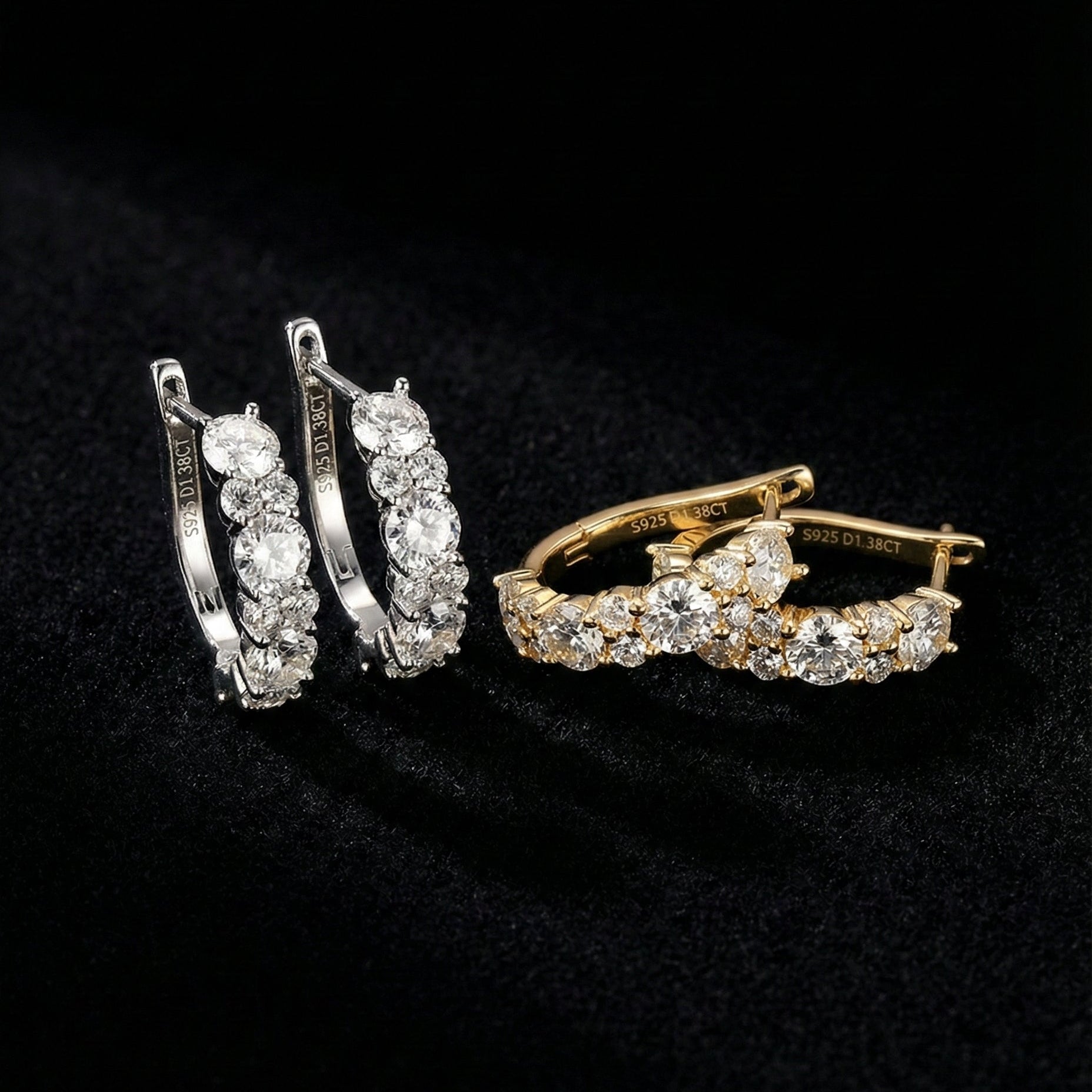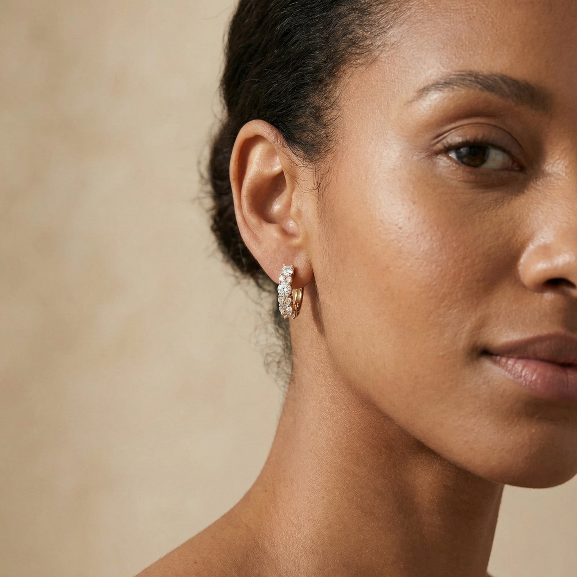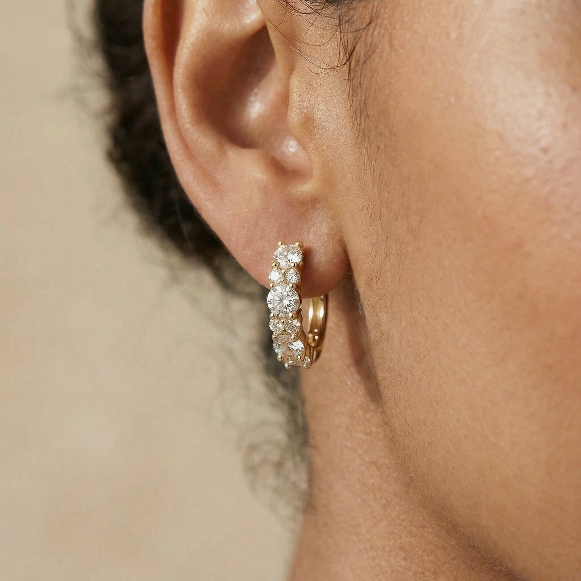 - A refined hoop silhouette illuminated by layered round-cut moissanite for balanced, everyday brilliance.
