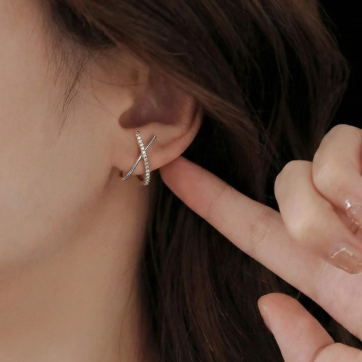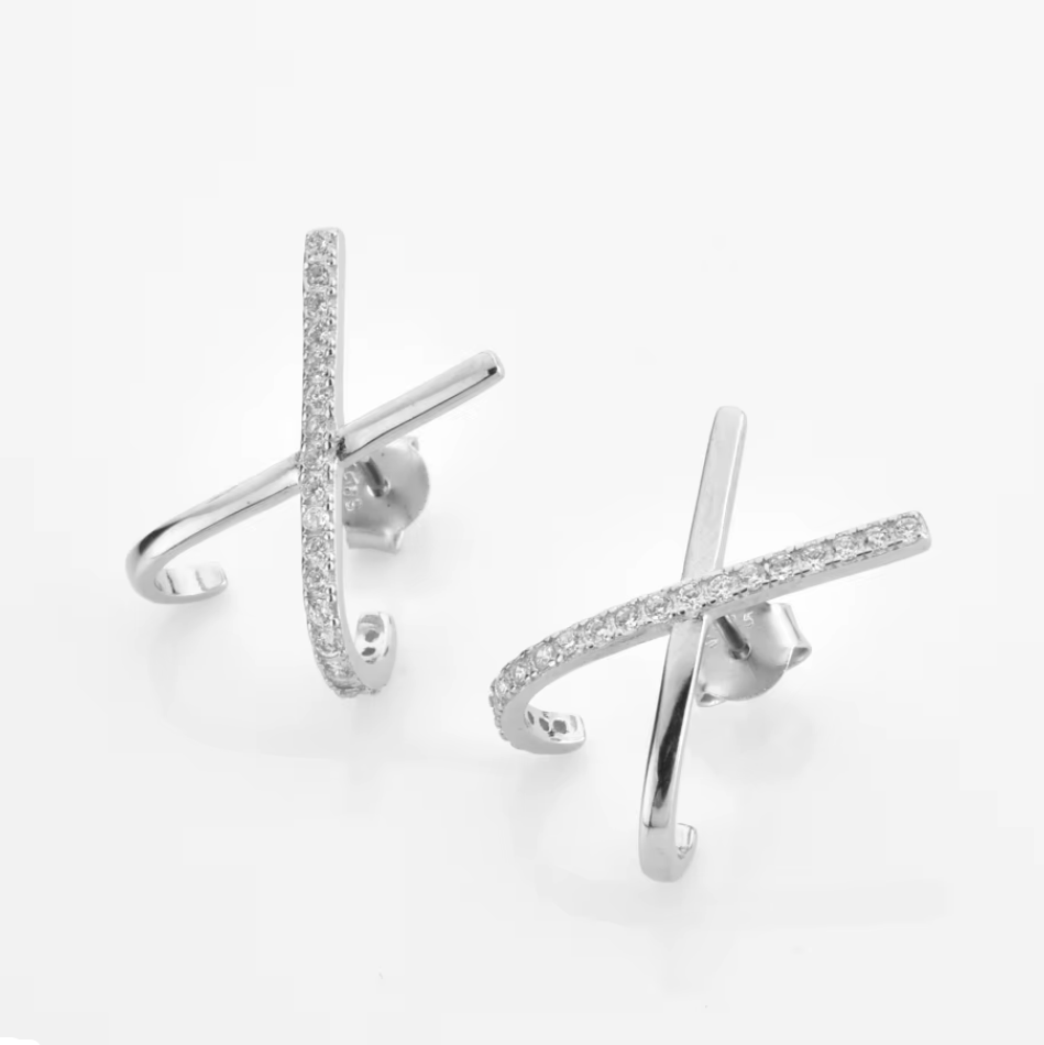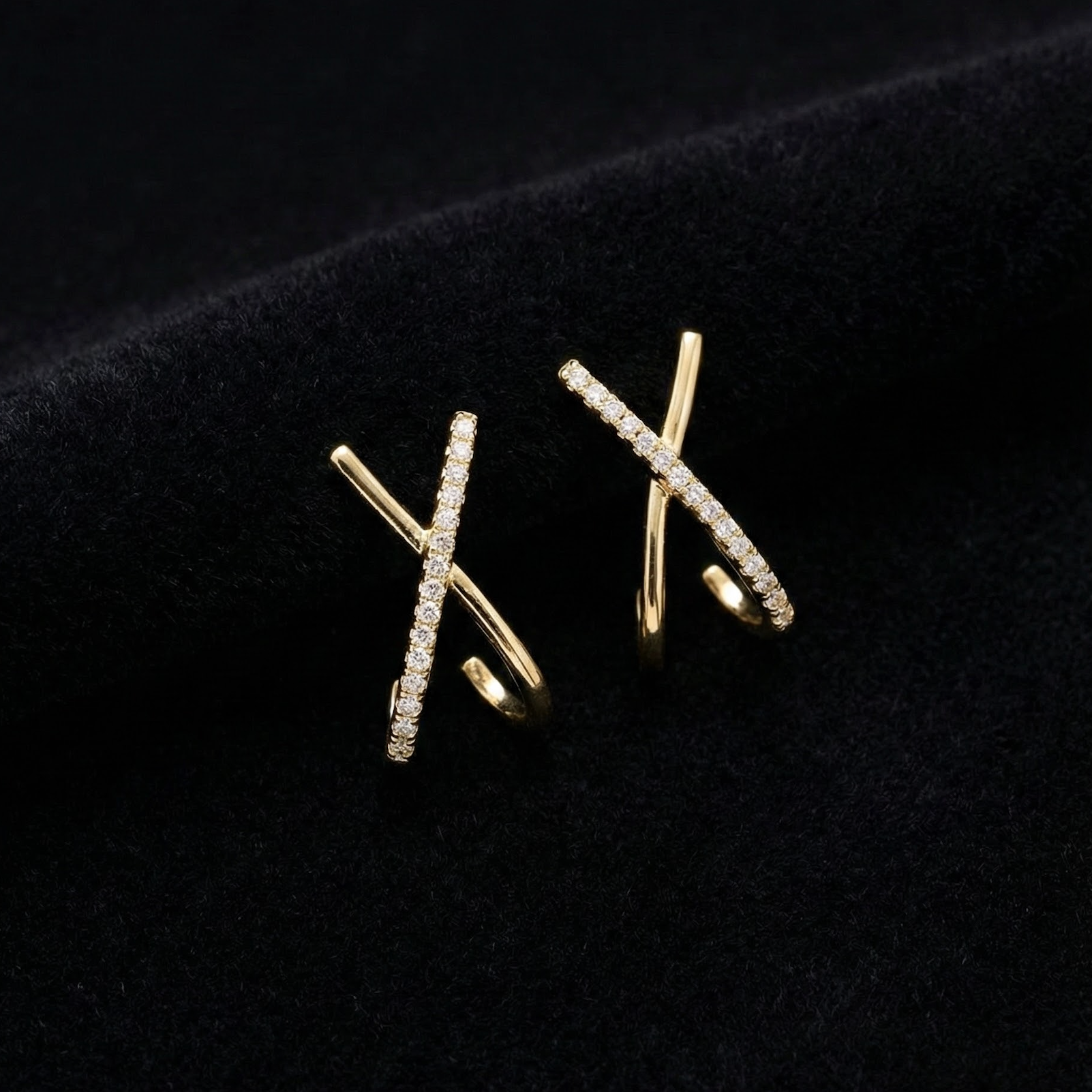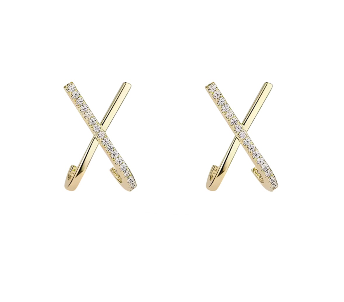Sleek golden arcs intersect with a delicate row of pavé-set stones, creating an elegant crisscross silhouette that hugs the ear with understated drama.