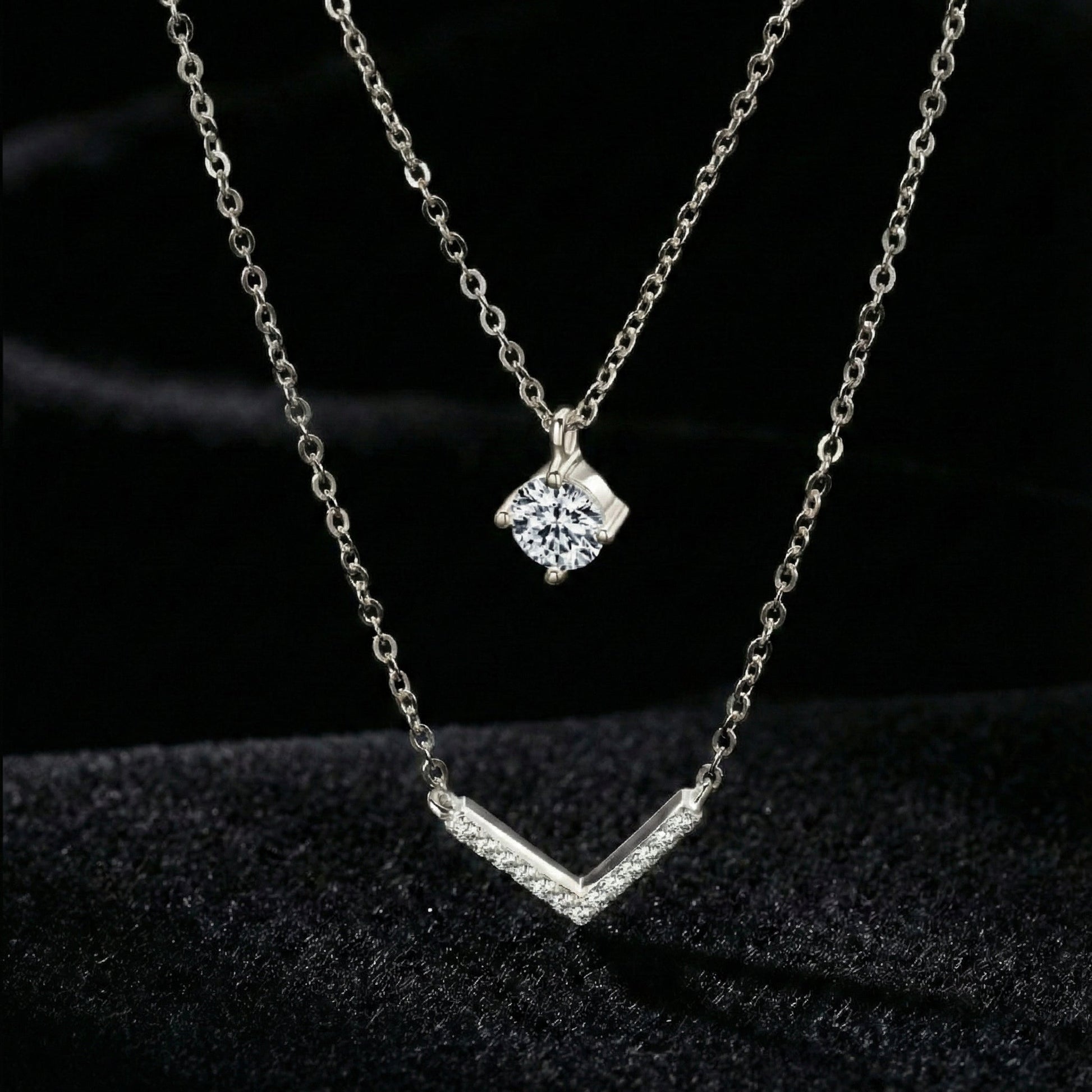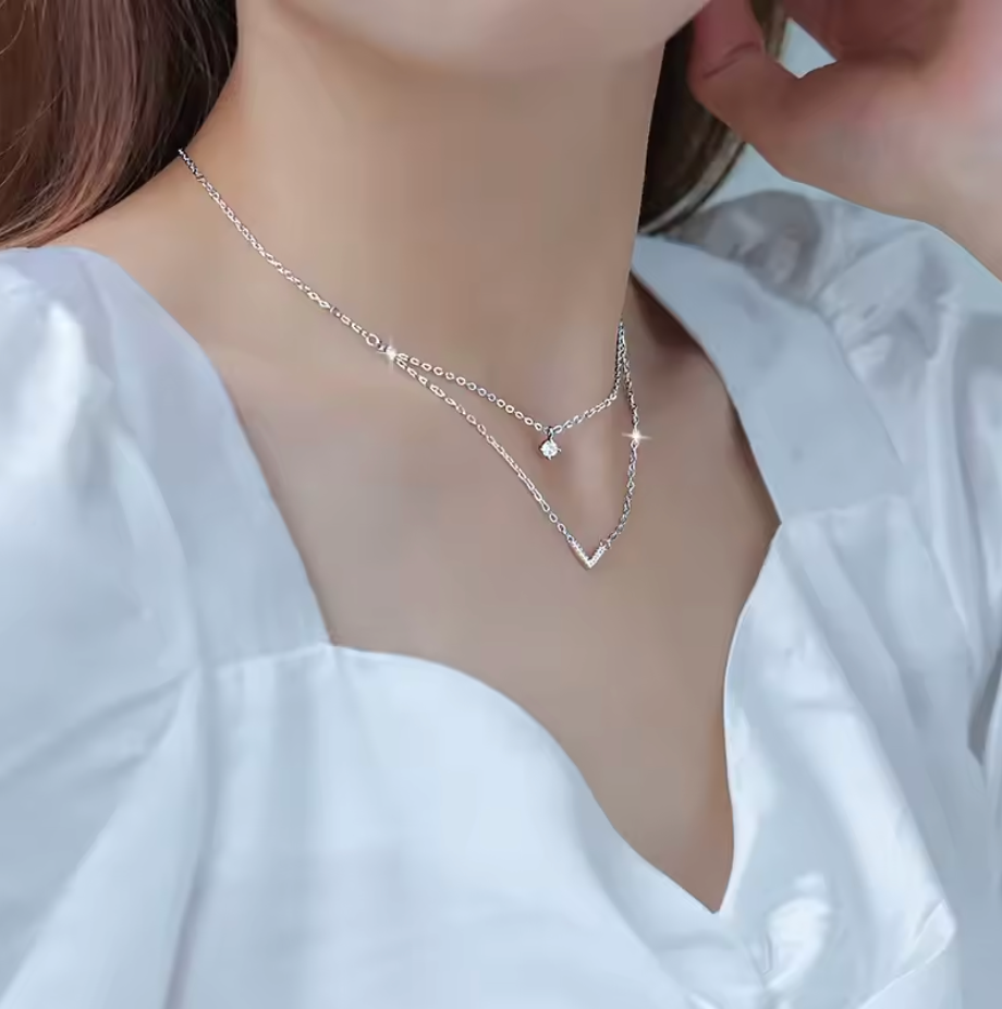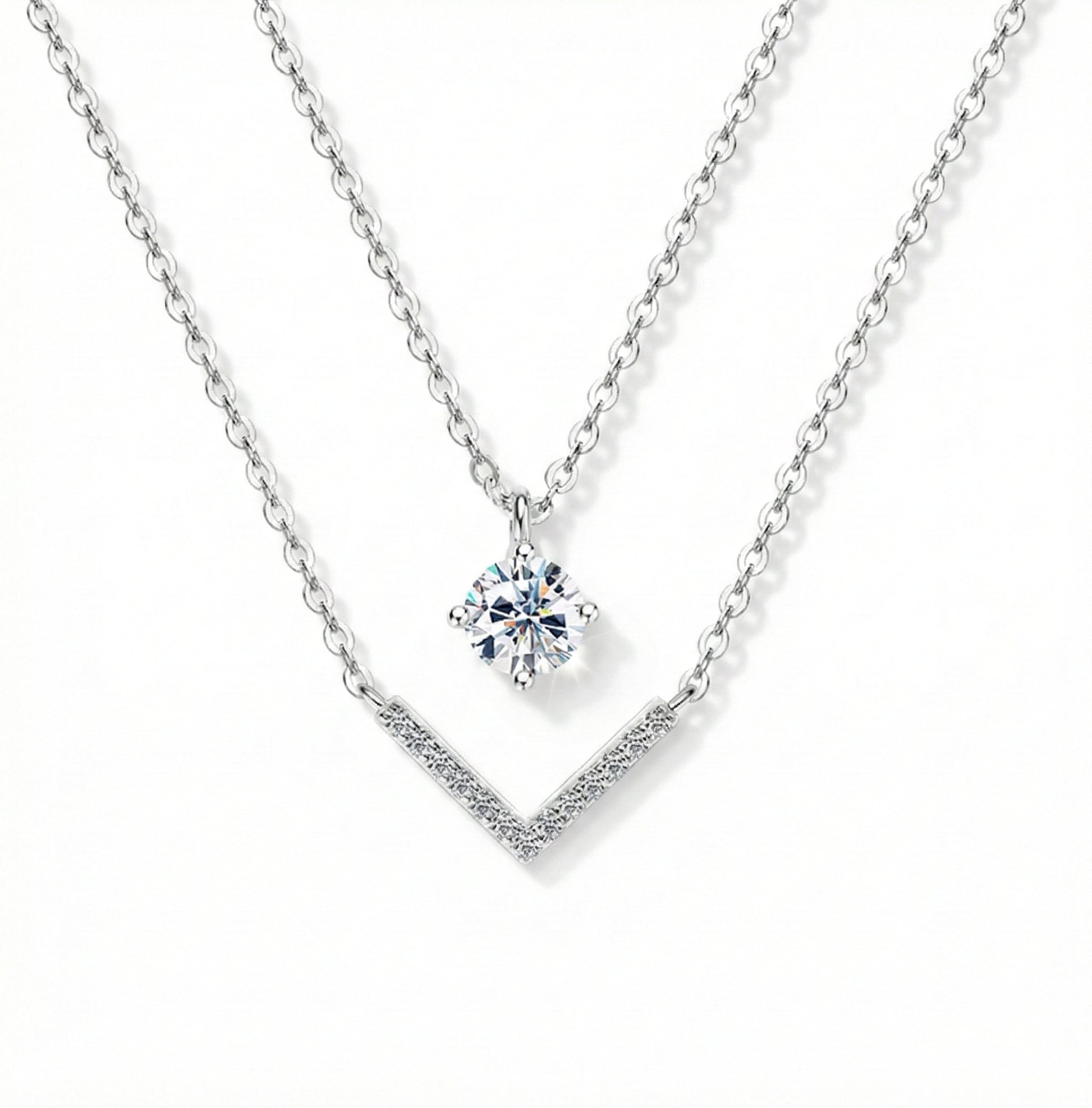 The Valura Necklace showcases a clean, double-chain silhouette anchored by our signature moissanite—cut to brilliance and prong-set for clarity.